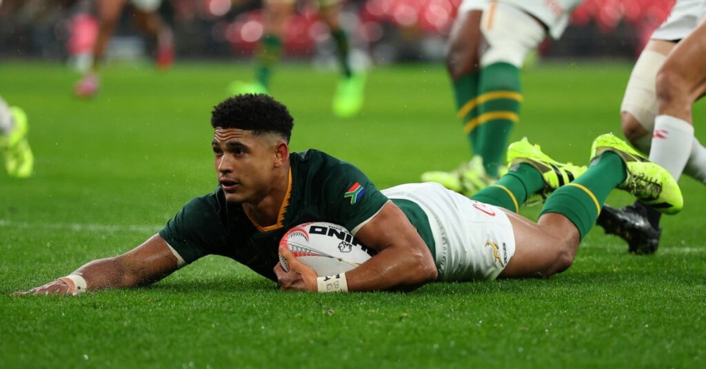 Still just as scary with their previous package, the Boks have added a new string to their bow with a player profile that they didn’t really have. A fly half capable of making individual differences with the ball in hand. His name is Sacha Feinberg-Mngomezulu, he’s 23 years old, and he overwhelmed the experienced Eddie Jones with his two tries in the first half.